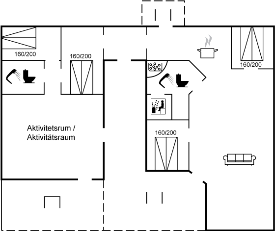 Ein geräumiges und gepflegtes Ferienhaus, das auf einem besonders schönen Gartengrundstück im südlichen Teil von Marielyst liegt. Das Haus besteht aus zwei Abteilungen, die durch eine kleine überdachte Terrasse voneinander getrennt sind. Die eine Abteilung enthält einen Aktivitätsraum, zwei gute Schlafzimmer und ein Badezimmer. Die andere Abteilung enthält eine Küche, ein großes Wohnzimmer mit Kaminofen, zwei Schlafzimmer und ein schönes Badezimmer mit Whirlpool und Zugang zur Sauna. Das Haus ist von mehreren schönen Terrassen umgeben, sowohl offene als auch überdachte, die zum Sonnenbaden, Entspannen und Grillen an langen Sommerabenden einladen. Nur wenige hundert Meter vom Haus entfernt befindet sich der Wald ” Bøtøskoven”, wo du mit ein wenig Glück die wilden Pferde sehen kannst, die frei in der Natur leben.Rauchen ist nicht zugelassen.