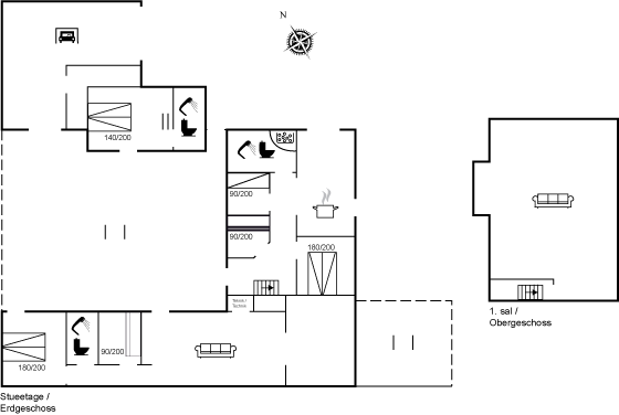 An der Zufahrt zum breiten Sandstrand in Blokhus liegt dieses große Ferienhaus zentral im Verältnis zum Stadtleben und zum Strand. Ein guter Ort für die große Familie mit herrlichem Blick auf den Strand und das Wasser von Obergeschoss des Hauses aus. Das Haus ist in 3 Einheiten aufgeteilt (siehe Grundriss), so dass zwischen den Häusern ein ungestörter Innenhof entsteht, in dem man viele Stunden im Freien genießen kann. Das Haus, das in den letzten Jahren einer umfangreichen Renovierung unterzogen wurde, präsentiert sich hell und einladend. Es gibt auch ein Gästehaus, das mit einem Schlafzimmer und eigenem Badezimmer ausgestattet ist. Der Ferienort Blokhus bietet Restaurants, Cafés und Einkaufsmöglichkeiten sowie einen gemütlichen Marktplatz an.Rauchen ist nicht zugelassen.