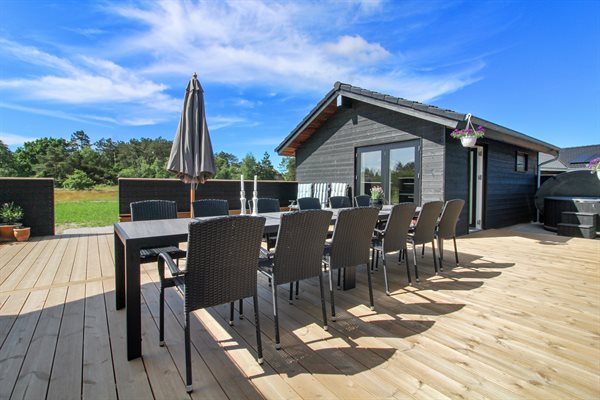 Ein schönes Ferienhaus für10 Personen und mit 5 guten Schlafzimmern sowie einem zusätzlichen Raum, wo z. B. Billard, Tischtennis und Arcade-Spiele zur Verfügung stehen. Vom schönen Wohnzimmer aus hat man direkten Zugang zur Terrasse, wo es viel Platz fürs gemütliche Beisammensein gibt und wo ein Hot Tub für pure Entspannung zur Verfügung steht.Rauchen ist nicht zugelassen.