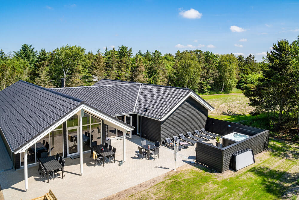 Dieses großzügige Ferienhaus in Blåvand, Dänemark, bietet Platz für 18 Personen und ist ideal für einen Urlaub mit Freunden oder Familie. Es verfügt über einen eigenen Poolbereich und einen Aktivitätsraum, sodass Unterhaltung und Entspannung garantiert sind. Die offene Küche und der Essbereich bieten genügend Platz für gemeinsame Mahlzeiten. Für Entspannung sorgen der Whirlpool und die Sauna. Die Terrasse mit Grillmöglichkeit und Außen-Whirlpool lädt zum Verweilen ein. Der Aktivitätsraum mit Tischtennis, Tischfußball, Darts und Billard sorgt für Spaß und Unterhaltung. Das Haus verfügt über sieben Doppelzimmer, die sich auf zwei Bereiche mit jeweils eigenem Bad verteilen, sowie vier weitere Schlafplätze auf dem ausgebauten Dachboden.