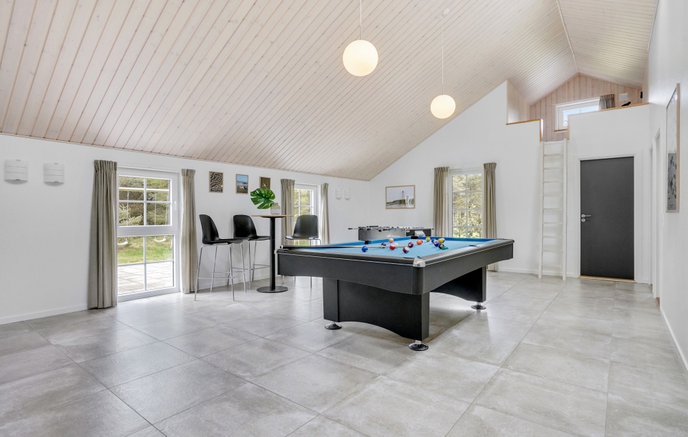 Dieses geräumige Ferienhaus in der Ferienregion Blåvand an der Nordsee bietet den perfekten Rahmen für einen unvergesslichen Familienurlaub. Mit Annehmlichkeiten wie einem Pool, Dampfbad und Aktivitätsraum bietet das Haus eine Vielzahl von Unterhaltungsmöglichkeiten. Der 24 m2 große Poolbereich mit Wasserfall und Volleyballnetz lädt zu stundenlangem Badespaß ein, während der Aktivitätsraum mit Billard, Tischtennis und Tischfußball für Abwechslung sorgt. Das Ferienhaus ist hell und einladend eingerichtet und bietet mit seinen luftigen Dachschrägen und sechs Schlafzimmern genügend Platz für mehrere Familien oder eine große Freundesgruppe. Der offene Wohn-/Essbereich mit gut ausgestatteter Küche und gemütlicher Sitzecke bildet das Herzstück des Hauses. Im Außenbereich laden eine Terrasse und ein großer Garten zum Entspannen und Spielen ein.